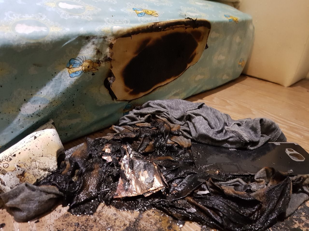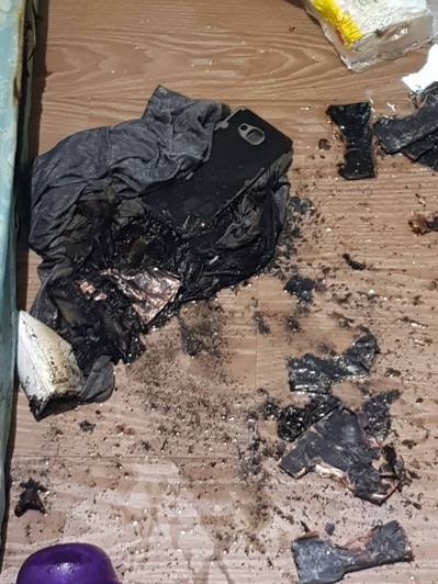 原PO在PTT上貼出幾張照片並且寫道,睡前把手機放在地板上充電,一大早半夢半醒之間,聽到輕微爆裂聲,醒來一看發現床頭有一團火燃燒,他趕緊澆水滅火,幸好沒有受傷。照片可見衣服被燒焦,床罩也燒出一個洞,火滅了之後才知道是手機的電池爆炸,推測背蓋彈飛後引燃旁邊的衣服和床單,而手機的本體則沒事。