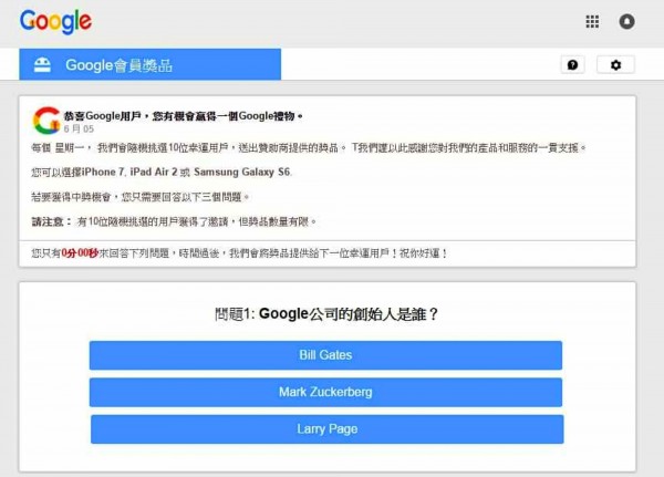 「Google的創辦人是誰?」,「Google創立的時間是何時?」、「Google設立的地點在哪兒?」,有網友最近在瀏覽網頁時,突然跳出Google的問卷贈大獎的視窗,獎品是iPhone新手機、平板或三星最新手機,有人認為自己受幸運之神眷顧,開心填寫答案再留下個資,期待「好康」禮物送來。
