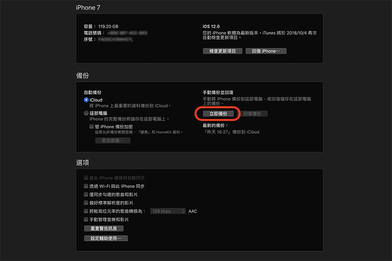 首先,先將 iPhone 透過 USB 連接到 Mac 或 PC,接下來在 iPhone 資訊欄中的「備份」右邊的「手動備份並回復」選擇「立即備份」,這樣 iTunes 就會將 iPhone 中所有資料備份到硬碟(不包括 App 安裝檔)。