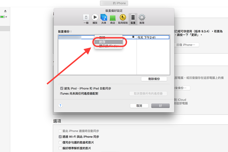 接下來如果想要將手動備份下來的資料保存在電腦內,可以在「iTunes」->「偏好設定」內的「裝置」,在備份檔上按右鍵「封存」。