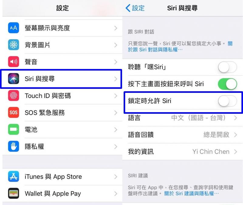 進入「設定」畫面,在選單列表上點選「Siri與搜尋」,點選「按下主畫面按鈕來呼叫Siri」的按鈕設定開啟後,就會出現「鎖定時允許 Siri」的開關按鈕,手動設定為「關閉」。以避免駭客或有心人士利用該漏洞缺陷,繞過螢幕鎖定,利用Siri 讀取手機的個人隱私相關資料。