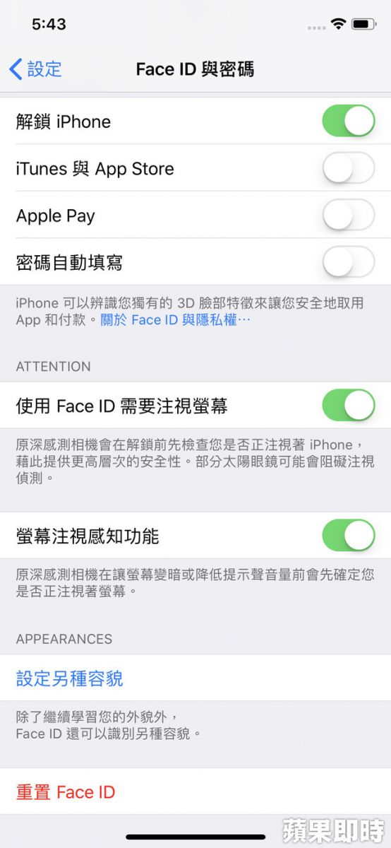 iPhone在取消Home鍵後,同時也把指紋辨識環移除,改用Face ID,雖然號稱有超強的辨識能力,但實際使用時,有時會出現掉漆現象,無法成功識別解鎖,升級到iOS12後,多了「設定另一種面容」,讓Face ID可以多加一張不同面容的臉來進行辨識,例如上班時有化妝,和在家素顏的面容,可以增加解鎖的成功性,同時也能用完全不同的第二張臉解鎖,但要移除時也必須兩張臉同步移除。