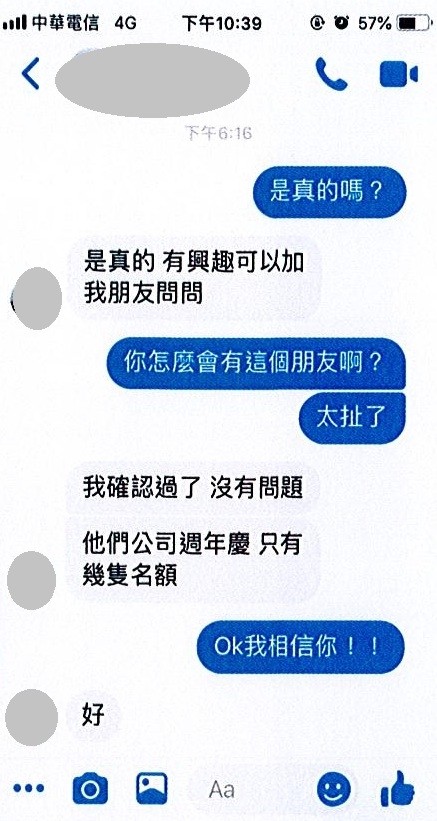楊男隨即加入指定LINE ID,與暱稱「陳琪玲」的小姐商談交易內容,對方稱在手機行上班,因為新店面開張,提供促銷限時優惠,對談中還要求楊男提供看到的該則臉書貼文,接著營造店內很忙,但因為是「認識的朋友」貼文介紹,跟經理額外協調後特別保留名額,並請楊男趕緊去匯款,完成後就包裝出貨。