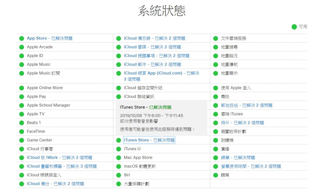 不過,截至記者發稿為止,目前蘋果官網的系統狀態服務報告更新頁面,列表的各項服務均顯示為正常狀態。值得注意的是,在 iTunes Store 這項服務,目前狀態為「已解決問題」,內容說明顯示「從 10 月 8 日晚上8點至11點45分,部分使用者曾受影響。使用者可能曾在使用此服務時遇到問題。」確認iTunes Store 問題目前已經獲得蘋果官方修復。