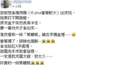 一名男網友在臉書社團「爆廢公社二館」發文,表示放假想拿出備用機蘋果i6 Plus出來玩,便打開抽屜,沒想到抽屜卻卡住了,費了好大一番功夫,才順利打開,還看到「一條『黑糖糕』藏在手機盒裡」,原來是手機電池膨脹到卡住抽屜,「螢幕爆了,排線也撐斷」,之後拿去給店員處理,店員竟回應一定是充電太飽、放太久造成的,讓原PO好無奈,「好貴的一條黑糖糕」。