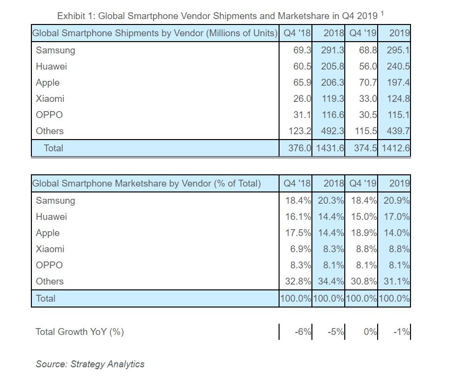 國際市場研究機構 Strategy Analytics,近日發佈2019年第四季全球智慧型手機的出貨調查報告,在10至12月期間,全球智慧手機的總出貨量約為 3.75 億支。目前在全球手機出貨量排行榜的前五大品牌為,蘋果、三星、華為、小米、OPPO,統計五大手機品牌於全球手機市佔率高達69.2%。相比2018年第四季同期,數據顯示,僅蘋果、小米兩大品牌的手機出貨量呈現正成長。