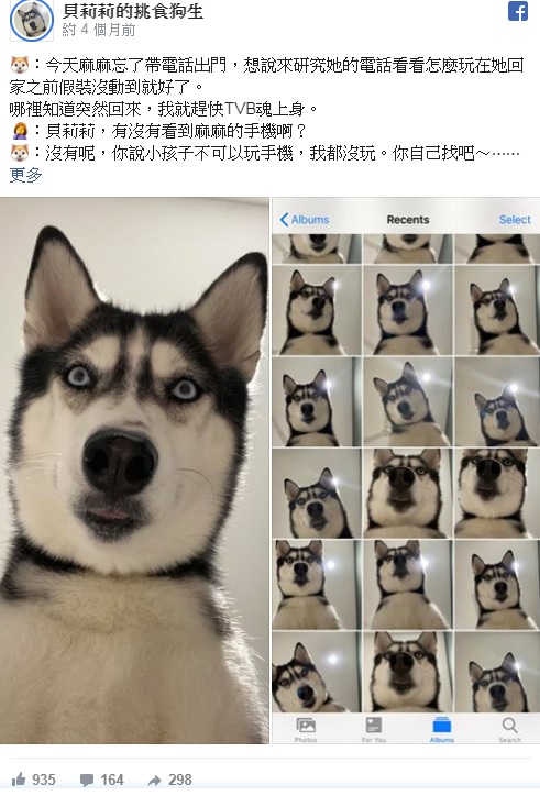 一名居住在馬來西亞的網友,替自家養的2歲哈士奇申請的社交網站帳號「貝莉莉的挑食狗生」分享一則有趣的故事。她先前模擬自家哈士奇的語氣、視角表示,「主人忘記帶手機出門,就來研究看看手機怎麼玩」結果變成了哈士奇自拍時間,只見網友主人回家後看到手機裡有20到30張的哈士奇自拍照,照片中哈士奇超呆萌地看著螢幕,讓她笑說「差點嚇暈」。