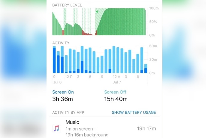 iPhone用戶經由「設定」>「電池」可看見電池使用狀況,網友因此發現Apple Music持續在後台運作,大量消耗電量。圖擷自MacRumors