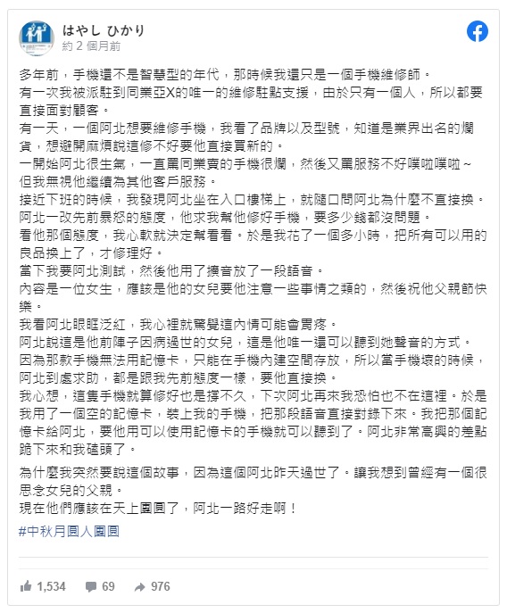 結束後他請阿伯測試,他便用擴音點開了一段錄音檔,內容大概是一個女生在叮嚀一些事項,還有祝他父親節快樂。阿伯聽完之後紅了眼眶,向原PO解釋,因為他女兒前陣子因病過世,他只能透過這種方式才能聽到她的聲音,因為這款手機只能用手機內建空間撥放,沒辦法存記憶卡,所以阿伯才會到處求助。