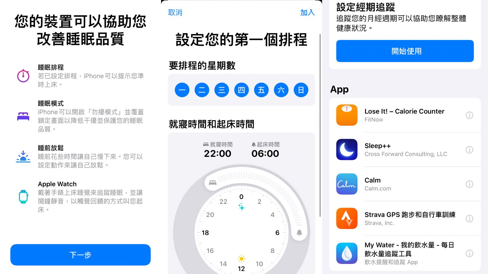 iPhone 上的「健康」App 目前可以幫助你設定睡眠目標並追蹤進度。開啟「健康」App 點選「設定『睡眠』」下的「開始使用」,接著點選「睡眠目標」可設定所需的睡眠時數。「就寢時間和起床時間」也可設定想在何時就寢和起床。