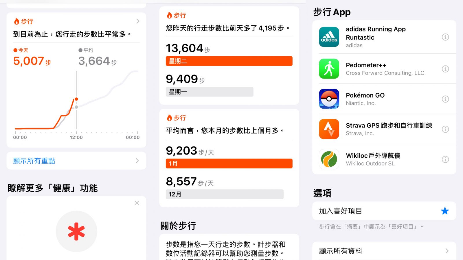 不知道大家平常是否關注運動數據?其實步行也是一個重要的運動方式,但不少人會忽略「健康」App 會自動計算的步數、步行和跑步距離。如果有 Apple Watch,也會自動追蹤你的「活動記錄」資料。大家可以關注一下每日步數,如果你平常運動時間有限,也可以提醒自己多多走路,透過 App 觀察數據的成長或許也能獲得一種小小成就感。