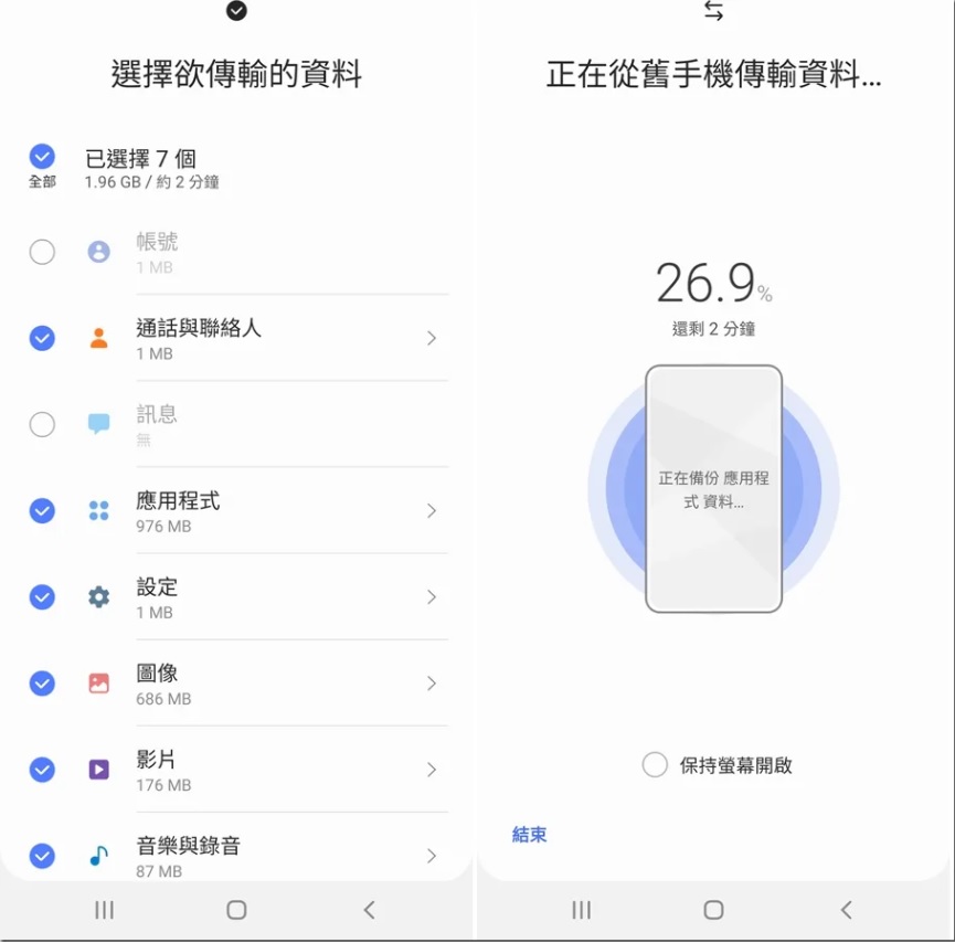 SMART SWITCH 可以轉移哪些資料呢? 在使用 Smart Switch 時,畫面會跳出使用者選擇「欲傳輸的資料」選項,包含通話與聯絡人、訊息、應用程式、設定、主螢幕、照片、影片、音訊和文件資料等,應用程式部分,如果是從 iOS 系統轉過來的話,只要 Google Play 上有對應的 app 可以下載那麼手機就會自動下載,若是從舊一點的 Android 手機轉移的話,只要 Google Play 上該 app 仍有上架,那也會自動下載。