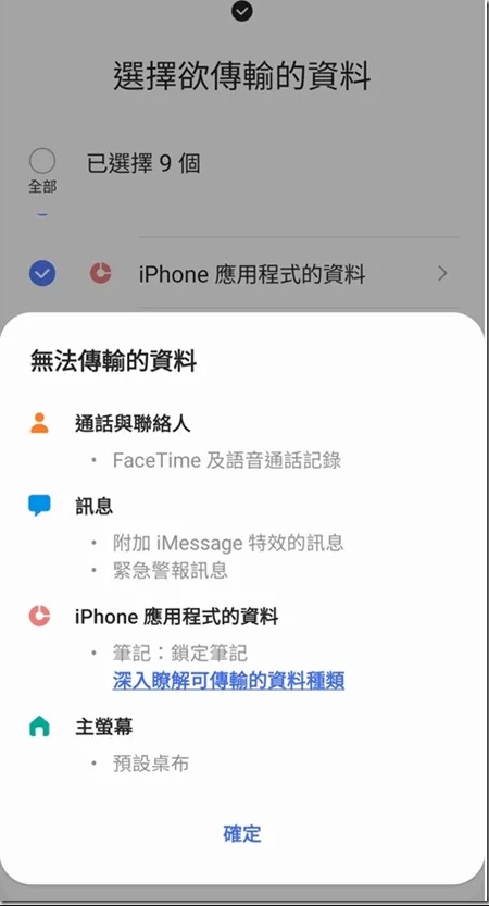 Smart Switch 會說明有哪些例外資料是無法傳輸的。