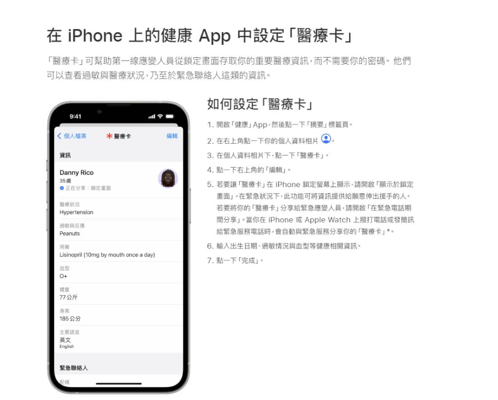 智慧型手機配有查詢緊急聯絡人與緊急醫療資訊的功能,方便周遭的人在第一時間了解患者的狀態。圖為蘋果手機中的「醫療卡」功能。(圖取自Apple Support網頁support.apple.com)