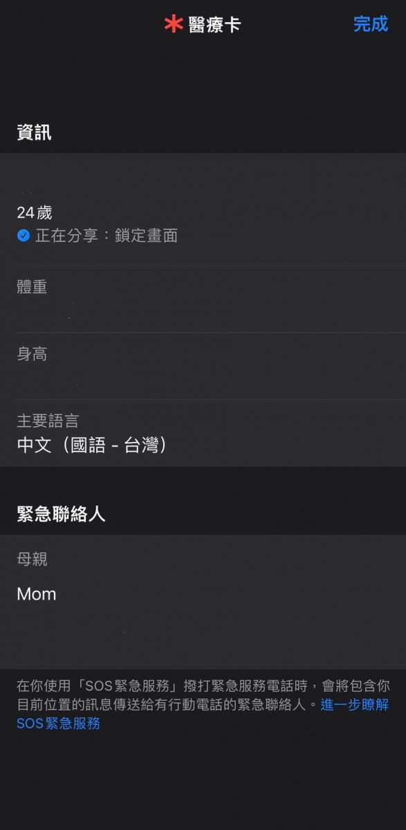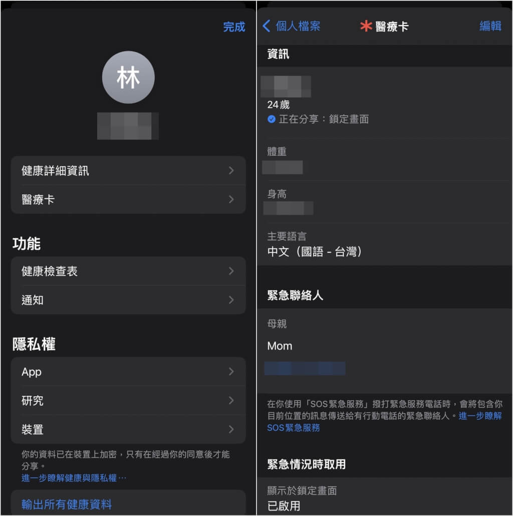 編輯完成後,到最下方「緊急情況時取用」項目,開啟「顯示於鎖定頁面」,在緊急危難時救護人員才可以在手機鎖定時看到資訊。
