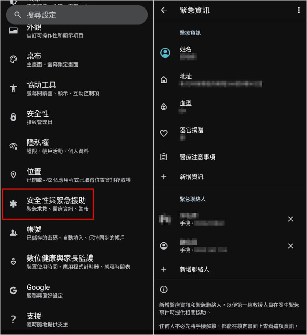 以Sony手機為例,開啟「設定」,點選「安全性與緊急援助」,就可編輯緊急聯絡人與個人醫療資訊。
