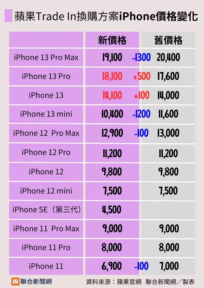 另有5款機型在此次調整換購價格時,被列入跌價機型,分別以iPhone 13 Pro Max換購價跳水1300元、iPhone 13 mini跌價1200元最慘,iPhone 12 Pro Max、iPhone 11、iPhone 8也跌價約200至100元。