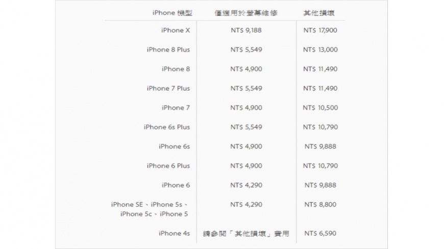 根據蘋果公司的台灣官網,以去年發售的新機為例,若iPhone X在保固期內螢幕損壞,維修價就要9188元,而iPhone 8 Plus和iPhone 8則分別為5549元和4900元,價差高出近1倍;更令人驚訝的是,如果除了螢幕以外的部分有損壞,iPhone X的修理費用高達1萬7900元,幾乎等同1支全新安卓旗艦機的價位。