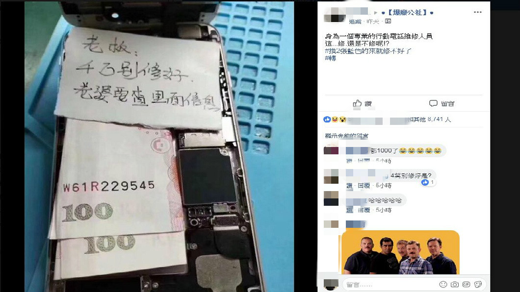 有網友在臉書社團「爆廢公社」發文並分享照片,發文內容提到,「身為一個專業的行動電話維修人員,這…修還是不修呢?」