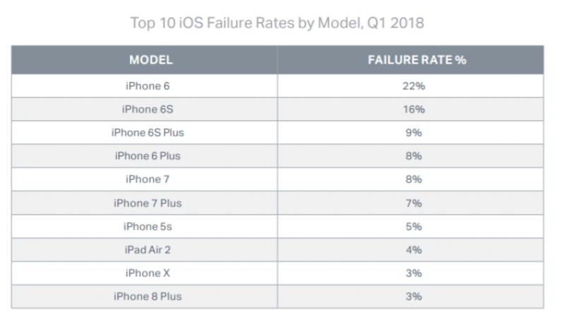 手機最常出現送修故障的狀況是什麼?iPhone、Android手機故障送修率佔比誰最高?根據國外資料安全公司 Blancco Technology Group近日發佈今年度第一季「行動裝置設備維修與安全性」的最新報告指出,在一月到三月期間,蘋果iPhone手機出現故障率最高的是iPhone 6,故障率達到 22%,其次排在第二的則是 iPhone 6s、故障率達16%。此外,去年上市的iPhone X、iPhone 8 Plus則是各佔3%。