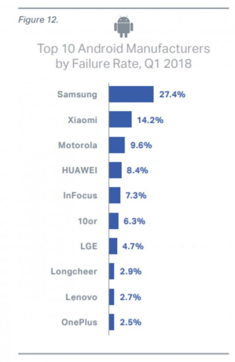 Android 行動裝置各品牌故障率排行。(圖翻攝自/Blancco Technology Group)